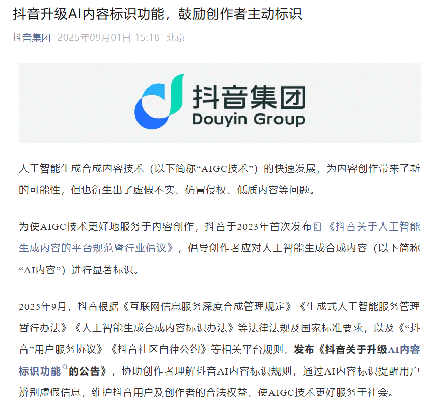 抖音集团发布《抖音关于升级 AI 内容标识功能的公告》