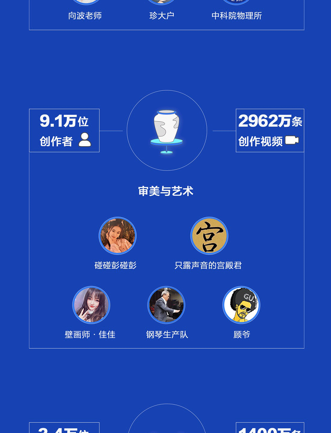 此外,安全与健康领域有3.4万名创作者,产出1400万条短视频。除了JJYOGA瑜伽、阿七教你瘦等健身领域达人,更有大家熟悉的“硬核医生”张文宏;道德与公民领域则由主流媒体领跑,1446名创作者产出145万条视频,排在前列的有河南广播电视台民生频道、光明日报、湖北日报等。