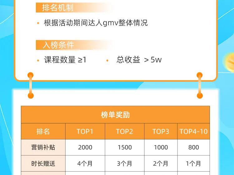 ps:活动期间,参与排位赛的达人须完成课程上传,并在上传课程时使用平台任意一种营销工具。