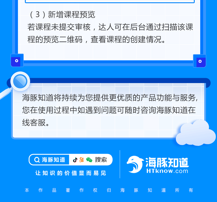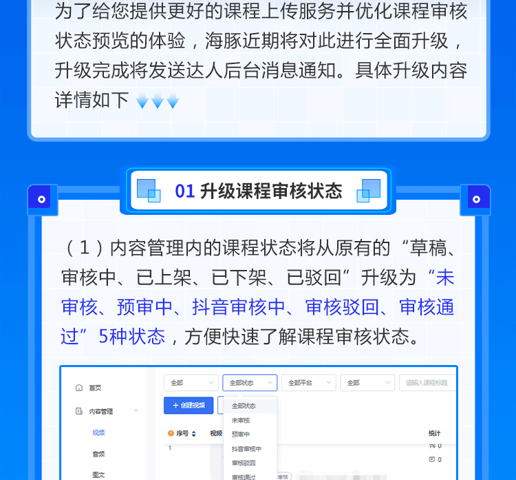 “海豚知道课程审核状态大优化”即将为您呈现,届时将于达人后台发布消息通知,请务必关注达人后台消息通知~
