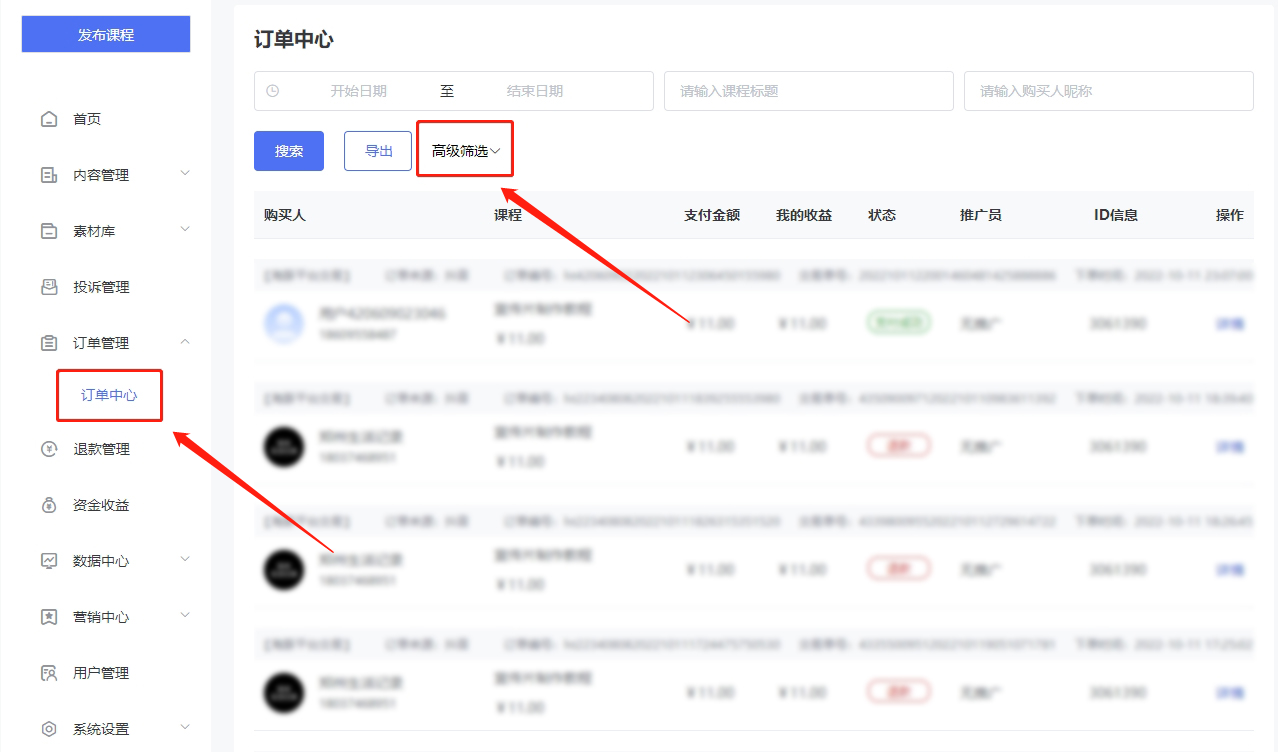 登录海豚知道达人后台→点击【订单管理】→点击【订单中心】→点击【高级筛选】;