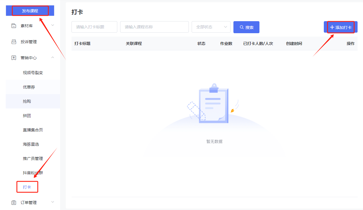1、登录海豚知道老师后台→选择【营销中心】→选择【打卡】→点击【+添加打卡】;