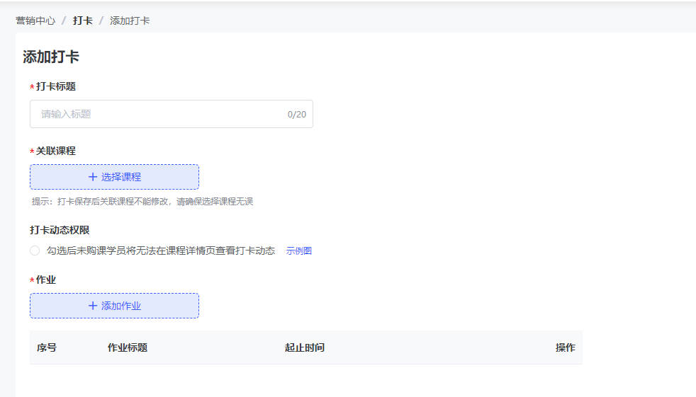 2、填写并选择“打卡标题”“关联课程”“打卡动态权限”信息,并添加“打卡作业”,点击【保存】;