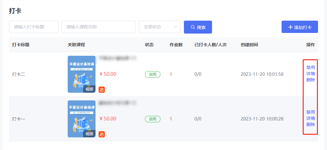 3、在打卡详情页中,可以对创建的打卡作业进行【禁用】【详情】【删除】等操作。