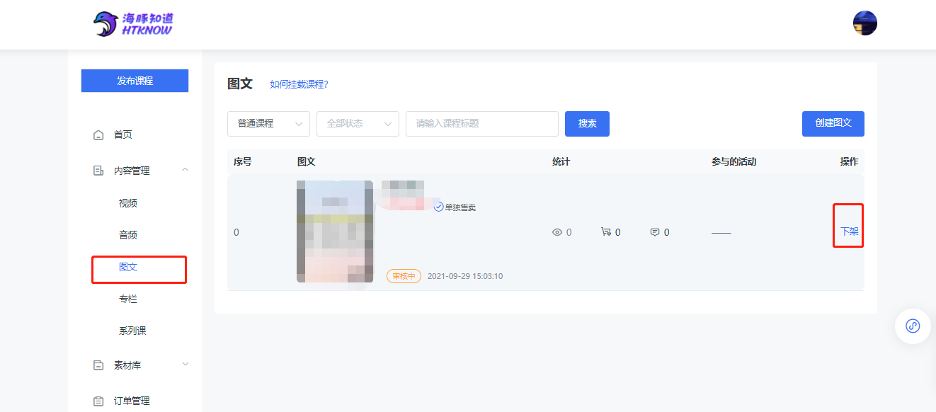 3、课程提交审核后,老师可在【内容管理】-【图文】处,看到课程的审核状态,并进行下架操作,如果课程审核成功,后台将显示浏览数、购买数、评论数、参与活动等信息,老师可在后台进行置顶、编辑、下架、预览等操作。